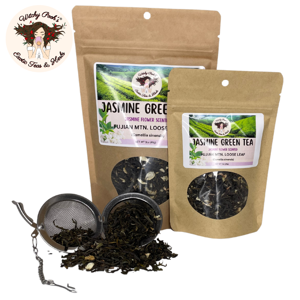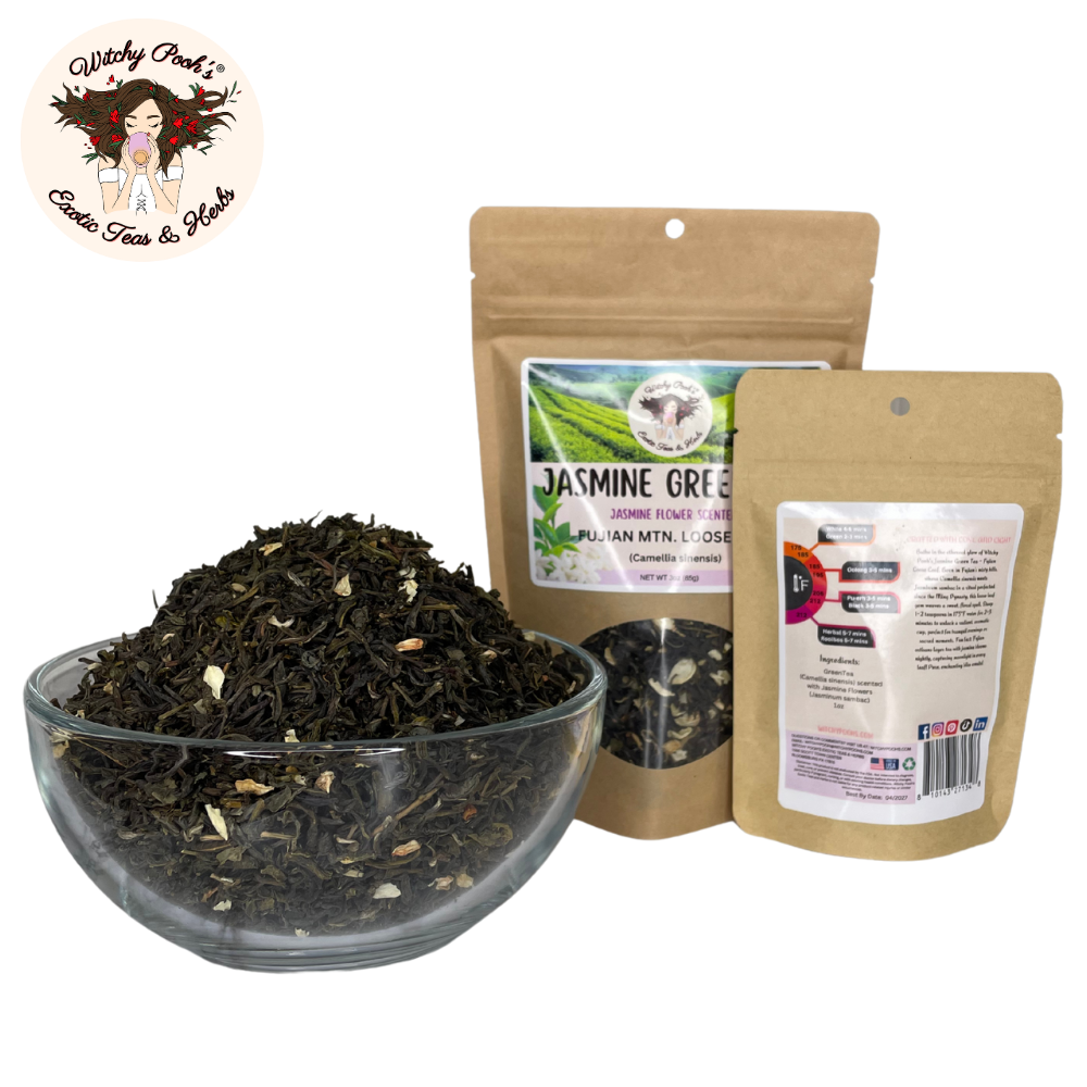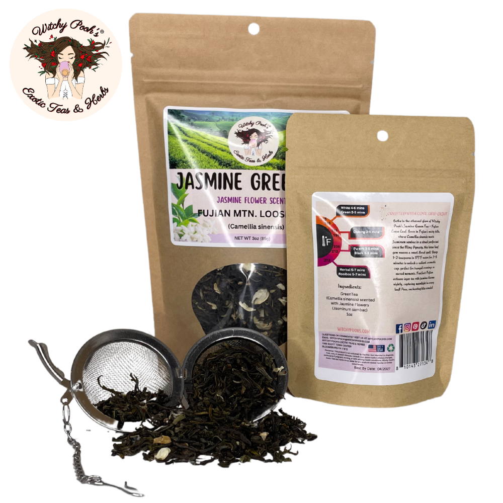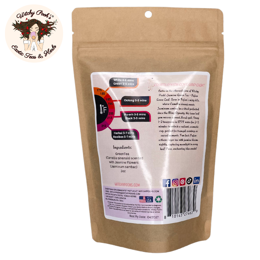 Witchy Pooh’s Jasmine Scented Green Tea is more than a beverage—it’s a legacy of ancient artistry, a spark of spiritual radiance, and a celebration of nature’s finest gifts. Ideal for gifting or elevating your own rituals, this tea invites you to sip deeply and let jasmine’s floral embrace lift your soul. Order now and immerse yourself in the timeless magic of Fujian’s jasmine-kissed mountains!