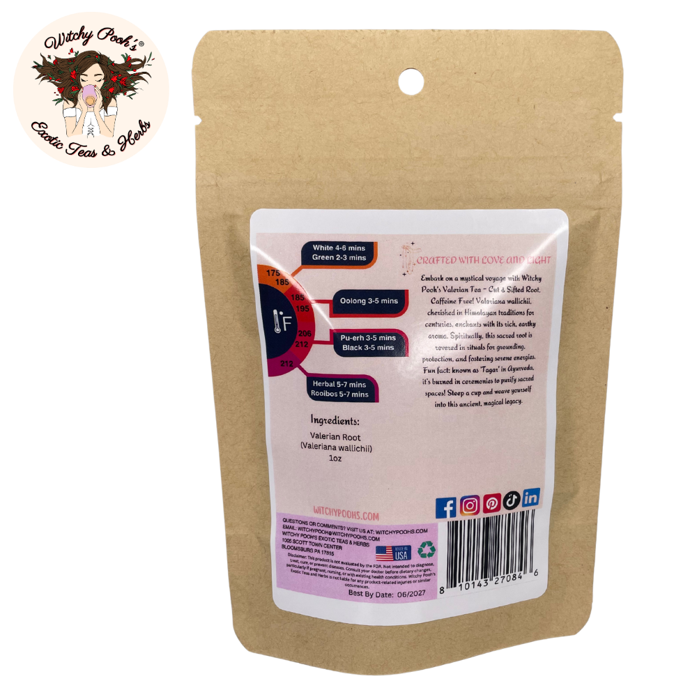 Discover the mystical allure of Witchy Pooh’s Valerian Tea, a caffeine-free blend crafted from the cut and sifted roots of Valeriana wallichii, or Indian Valerian, native to the Himalayas. Known for its musky, woody aroma and earthy flavor, this tea is packaged in a resealable kraft pouch for lasting freshness.Spiritual Uses: In Ayurvedic and Himalayan traditions, Tagar is prized for grounding and protection. Brew it for meditation to foster calm, or place roots in sachets to ward off negative energies. Used in rituals, it enhances dreamwork, inviting vivid dreams when placed under pillows, and is burned as incense to honor deities and purify spaces.History: Revered in Ayurveda for centuries, Valeriana wallichii is cited in texts like the Charaka Samhita for calming the mind and spirit. Native to India, Nepal, and China, it’s used in Himalayan rituals to promote meditation and dispel negativity, distinct from European Valeriana officinalis.Uses: Steep 1-2 tsp of roots for 5-10 min for a soothing tea, ideal for evening rituals. Use steeped roots in spell jars or scatter for spiritual barriers. Grind into incense for cleansing. Embrace its ancient magic for tranquility.